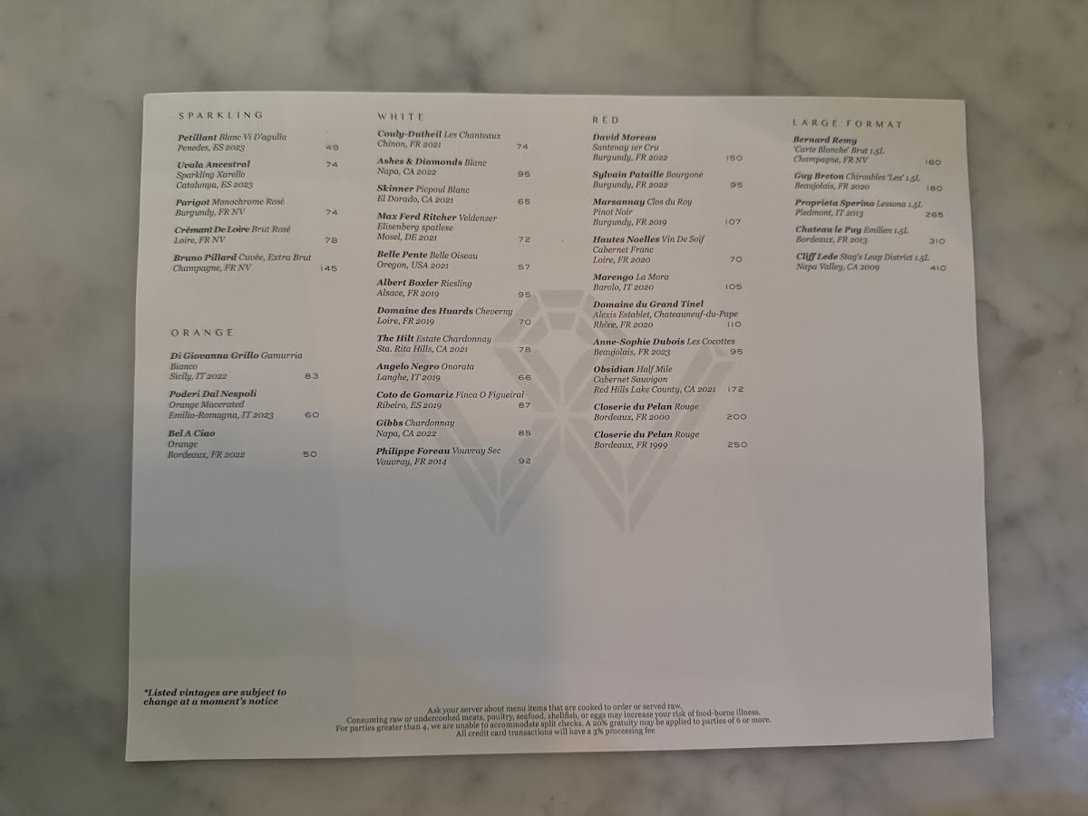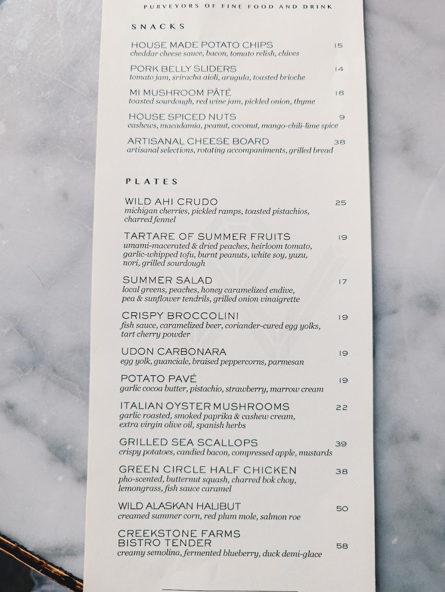 As for the main courses, the beef tartare stands out with its finely chopped Creekstone Farms tenderloin, featuring a rich blend of kombu and yuzu mayo, toasted peanuts, dried blueberries, and nori potato chips at $24. For those seeking something light and satisfying, the burrata with toasted challah and truffle honey combines creamy textures with a hint of earthiness, while the salad of local greens is a refreshing choice dressed in truffle vinaigrette.