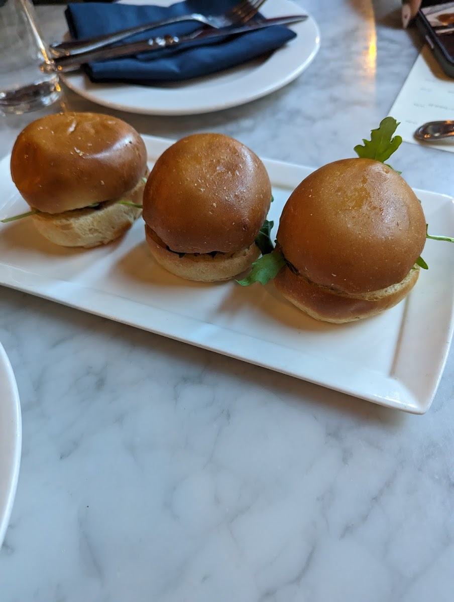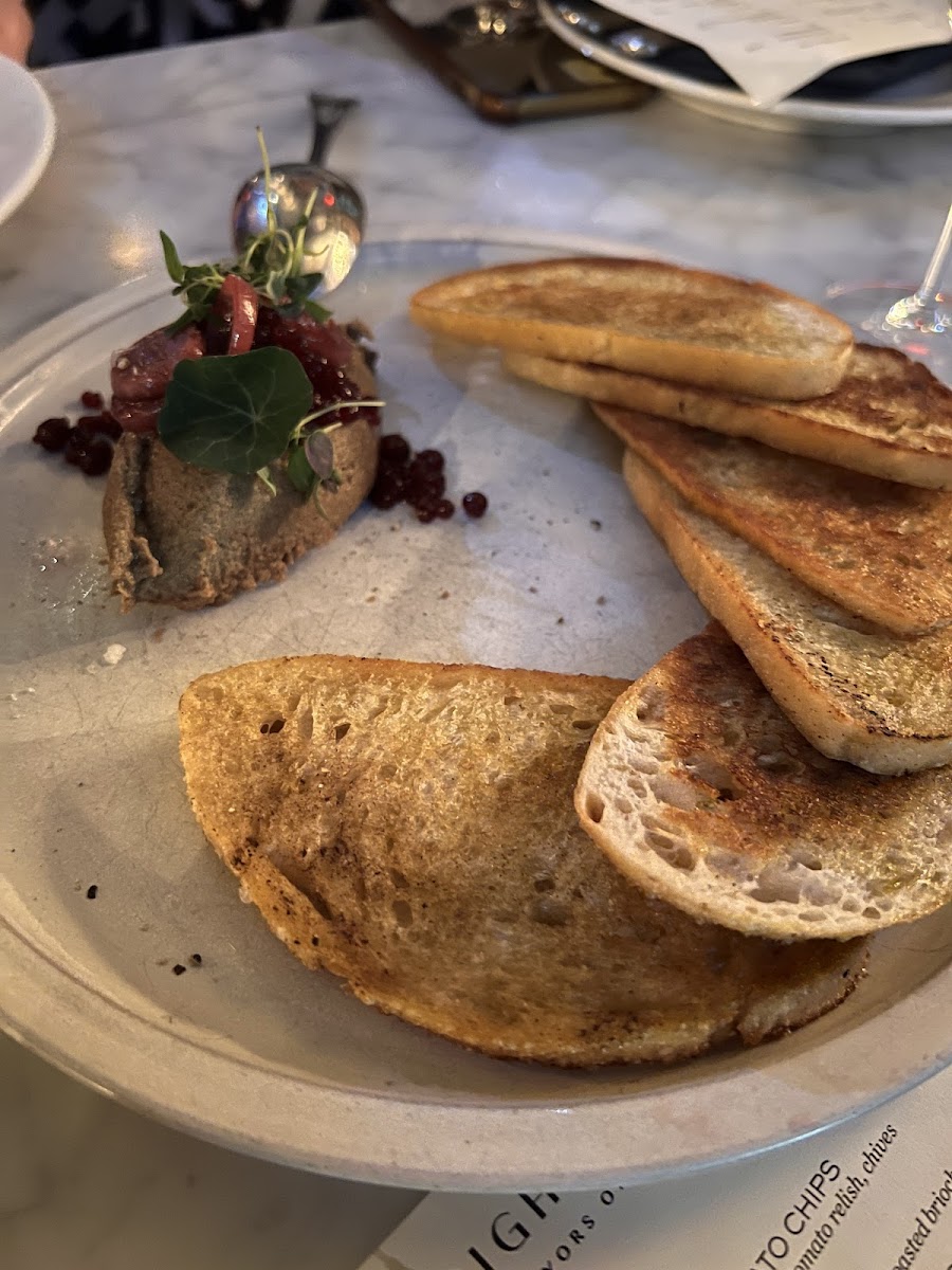 Vegetables take center stage in the crispy Brussels sprouts, which are tossed in a sweet chili sauce and elevated by the playful crunch of Rice Krispies, finished with fresh herbs. This interesting pairing not only excites your palate but also offers a delightful visual presentation for $17. If you're in the mood for something unique, the mi mushroom pâté served on toasted sourdough with red wine jam and pickled onion creates a medley of flavors that dance on your tongue, all for $18.